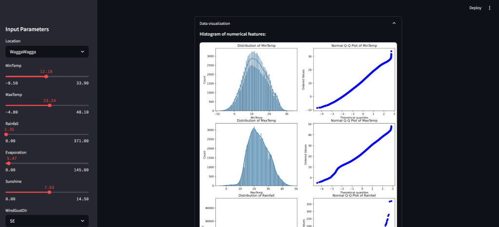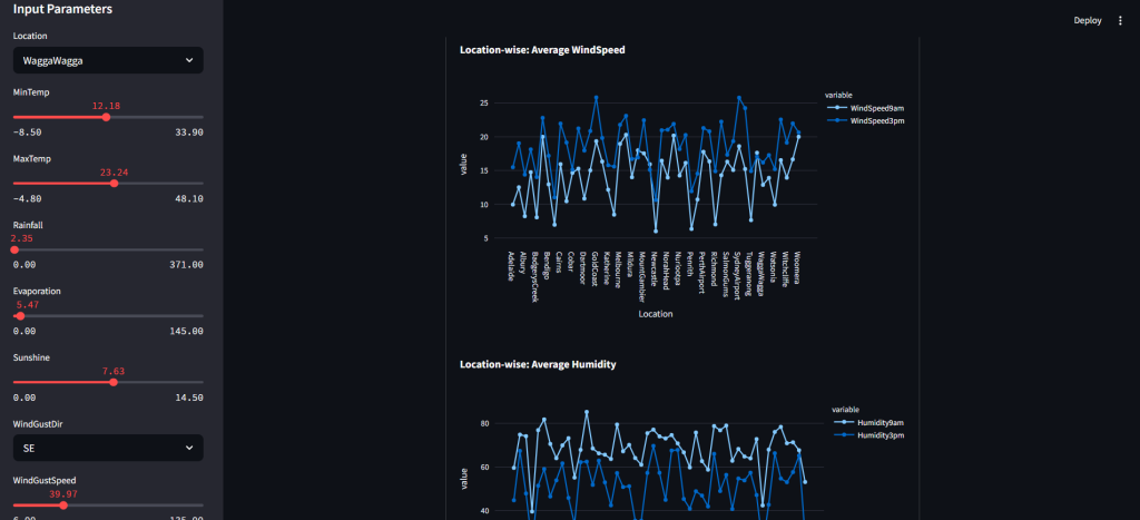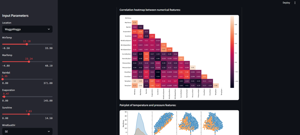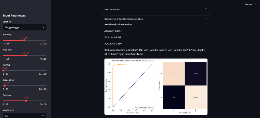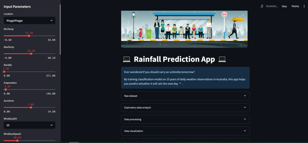 In this project, I built a Streamlit-based interactive web application that predicts whether it will rain tomorrow in Australia. The model behind this app is trained on 10 years of historical weather observation data from the Australian Bureau of Meteorology (BOM) using a Random Forest Classifier.